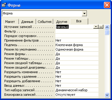 в режиме Конструктора и диалоговое окно свойств формы. В качестве источника