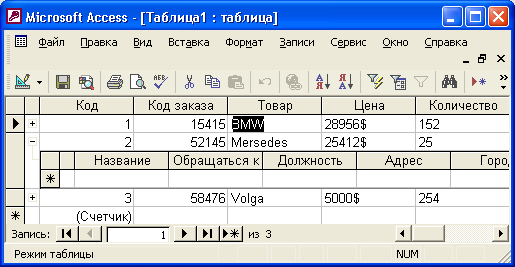 записей 1 и 2 открыты окна подчиненных таблиц. В окне подчиненной таблицы отображаются