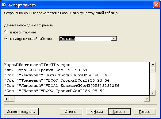 импорте данных в существующую таблицу Access 2002 просматривает поля слева