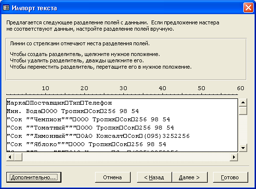 разделители полей, то укажите символ разделителя на втором шаге Мастера импорта