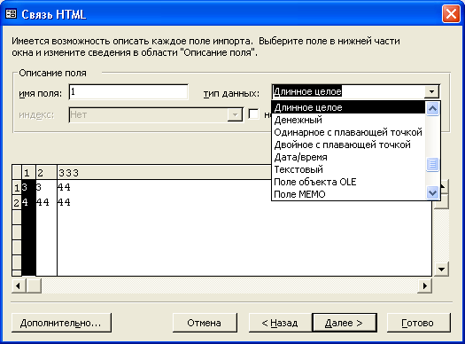 окне мастера можно описать каждое поле импорта: имя поля, тип данных. Индексироваться