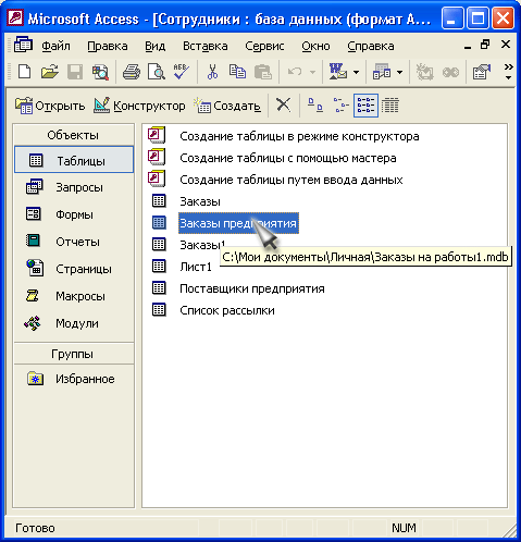 В Access 2002 вы можете легко проверить, в каком файле лежит присоединенная таблица. Для этого достаточно навести указатель мыши на таблицу, и вы увидите всплывающую подсказку, в которой указан тип файла и полный путь к нему (рис. 3.37).