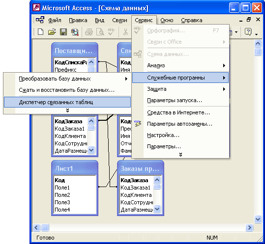Диспетчером связанных таблиц: