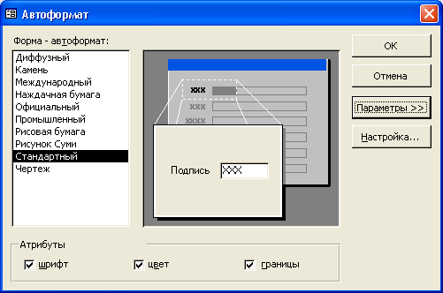применить для форматирования формы. В составе Access 2002 есть несколько встроенных