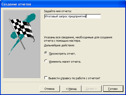 (Finish) для завершения создания отчета. Мастер отчетов создаст
