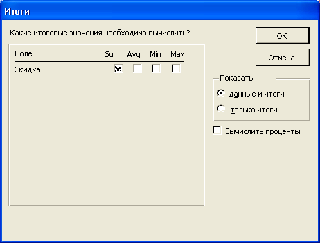 из них флажки Sum, Avg, Min и Мах. В зависимости от установленных флажков