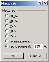Изменить масштаб позволяет также команда Вид/Масштаб. После ее активизации открывается диалоговое окно Масштаб (рис. 2.2), в котором на выбор предлагаются те же стандартные значения масштаба, что и в рассмотренном нами списке. Кроме того, здесь предусмотрено поле для указания произвольного значения масштаба.