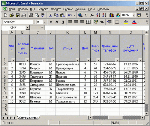 Очень неудобно работать с таблицей, если не видны заголовки строк и столбцов. Для устранения этого недостатка области таблицы следует закрепить, что позволяет при просмотре областей списка одновременно видеть на экране часть его заголовка и расположенные слева столбцы. С целью закрепления областей в нашей таблице выделите ячейку D2 и вызовите команду Окно/Закрепить области. В этом случае в просматриваемой строке всегда будут видны порядковый и табельный номера, а также фамилия сотрудника (столбцы А:С и строка 1). Пример одновременного отображения различных областей таблицы приведен на рис. 4.19.