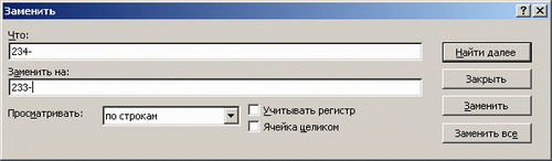 Рис. 4.23. Диалоговое окно Заменить с начальными цифрами телефонного номера, который нужно найти, и цифрами для замены начальных