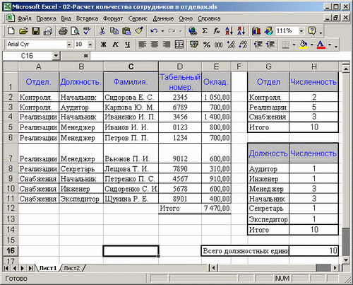 Предположим, нам необходимо определить, сколько сотрудников числится в отделах контроля, реализации и снабжения.