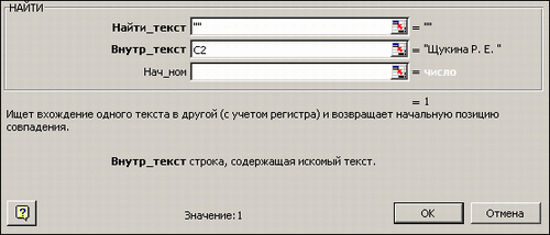 Данная функция находит вхождение одной текстовой строки (искомый_текст) в другую (просматриваемый_текст) и начальное положение искомого текста относительно крайнего левого символа просматриваемого текста.