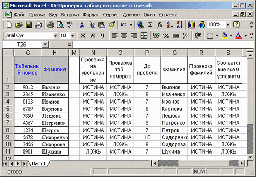Рис. 5.22. Рабочий лист с формулами для определения соответствия двух таблиц
