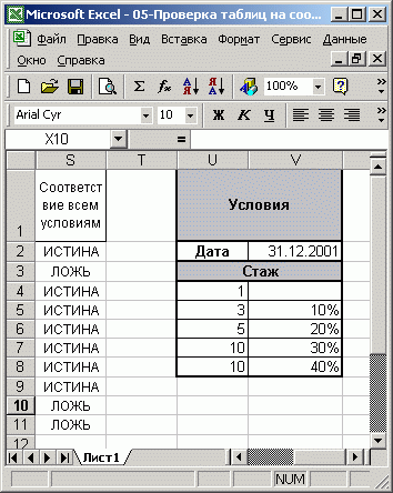 Условия начисления премии, описанные в табл. 5.1, можно поместить в любое место рабочего листа. Расположите таблицу с этими данными, скажем, в диапазоне ячеек U1:V8 (рис. 5.23), следующим образом: