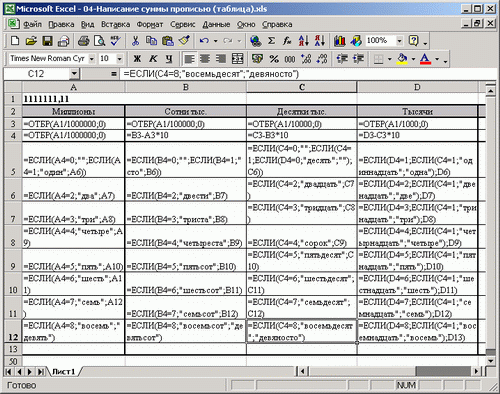 Рис. 6.20. Рабочий лист с формулами написания чисел от тысяч до миллионов