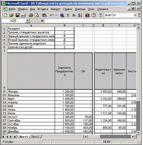 В области Е9:Е20 и G9:G20 будут вводиться суммы, полученные по совместительству. В ячейку F9 помещена формула, производящая вычисление налога по совместительству за январь: