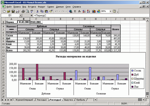 В таблице на листе Расходы2 (рис. 9.32) отражается расход материалов на изготовление изделий всех наименований. Из нее можно почерпнуть информацию и о стоимости материалов, израсходованных на изготовление определенных изделий.