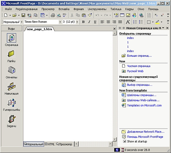 1. В меню Файл (File) выберите команду Создать (New), а затем в открывшемся подменю — опцию Страница или веб-узел (Page or Web). В результате в главном окне программы FrontPage появляется панель Создание веб-страницы или узла (New Page or Web) (рис. 11.1).