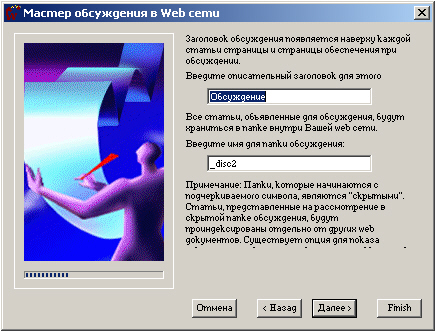 6. В следующем диалоговом окне мастера (рис. 11.23) расположены два поля. В верхнее поле введите заголовок дискуссии, а в нижнее — название папки, в которую будут помещаться сообщения дискуссионной группы. Вы можете оставить название папки, предлагаемое мастером по умолчанию. Завершив ввод информации, перейдите к следующему шагу, нажав кнопку Далее.