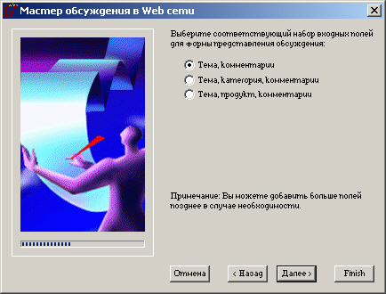 На следующем шаге работы мастера (рис. 11.24) необходимо указать, какие поля первоначально должна содержать форма для представления замечаний по ходу дискуссии. По умолчанию в нее предлагается включить поля тема (Subject) и заметки (Comments). Впоследствии в форму можно будет помимо выбранных, добавить и другие поля. Установив требуемую опцию, нажмите кнопку Далее.