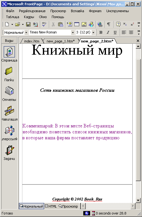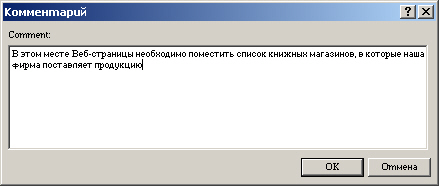 Введенный в диалоговом окне Примечание (Comment) текст размещается на Web-странице после слова примечание (рис. 14.11). При просмотре страницы в браузере он не виден.