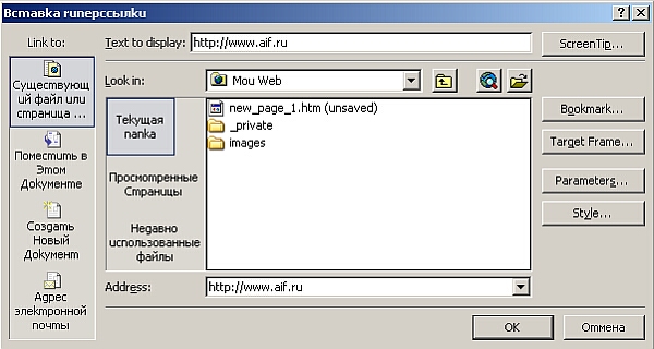 (Insert Hyperlink). Обратите внимание на поле Адрес. После имени страницы, на