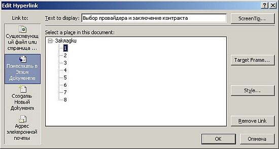 9. Выделите в списке название первой закладки, на которую создаете ссылку, и