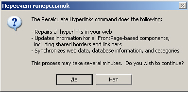 Время от времени, после внесения в Web-узел больших изменений, удаления из него отдельных файлов или страниц, необходимо провести операцию пересчета гиперссылок, при которой происходит обновление списка ссылок Web-узла.