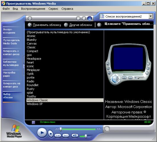 Новая версия Проигрывателя Windows Media позволяет настраивать внешний вид программы: от привычных до самых экзотических. Вы можете также определять перечень средств воспроизведения, используемых в окне. Программы, управлять отображением списка воспроизводимых файлов, названием файла и зрительных образов.