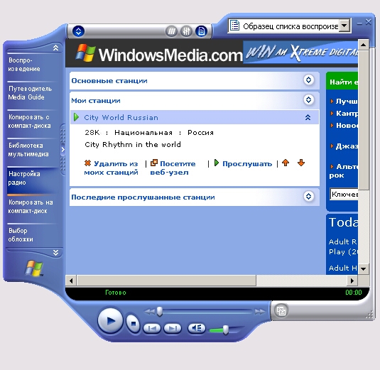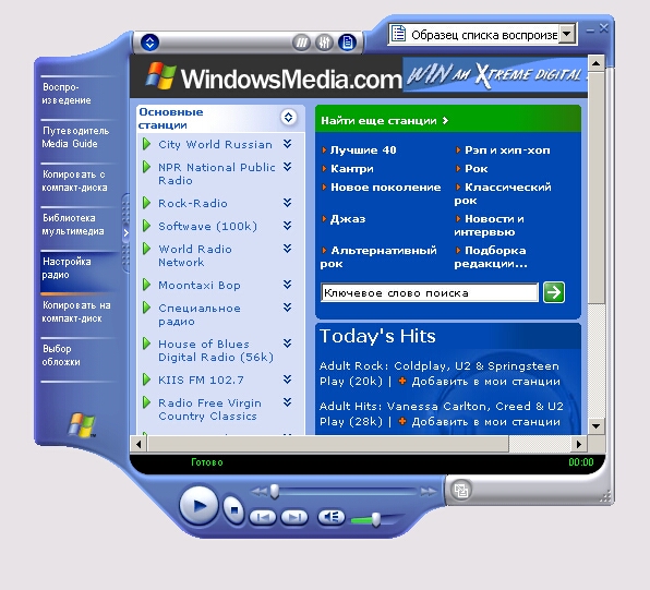 проигрывателя Windows Media можно прослушивать вещающие через Интернет радиостанции. Для этого нажмите кнопку Настройка радио или перейдите на вкладку Radio путеводителя мультимедиа.Замечание
