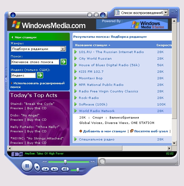 В отличие от обычного радиоприемника, который позволяет вам прослушивать только местные радиостанции, Интернет дает вам доступ практически к любым радиостанциям мира. Выбрать интересующую вас радиостанцию из огромного списка не так просто, поэтому в Windows Media имеются специальные средства для поиска радиостанций. Одним из них является упомянутая нами ранее область STATION FINDER. Для простого поиска служат нераскрывающиеся списки, расположенные в верхней части области. В левом списке указываются варианты группировки станций, а в правом — возможные значения выбранной группировки. Например, с помощью этих списков вы можете найти список радиостанций России, вещающих в Интернете. В расположенной ниже списков таблице отображаются радиостанции, удовлетворяющие условию выбора.