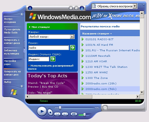 Наиболее простой способ поиска Web-узлов, содержащих музыку, состоит в использовании вкладки Найти еще станции (рис. 6.14). В верхней части вкладки находятся ссылки на наиболее популярную на данный момент музыку, а ниже этих ссылок — область поиска интересующей вас музыки. При выборе ссылки открывается Web-страница, Которая содержит описание выбранного альбома или певца, а также ссылки на видеоклипы и звуковые файлы. При выборе этих ссылок осуществляется воспроизведение мультимедийного файла.