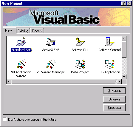 Если вы не хотите, чтобы диалоговое окно New Project появлялось при последующих запусках Visual Basic 6, установите флажок Don't show this dialog in the future (He показывать этот диалог в дальнейшем), находящийся в нижней части окна. При этом окно New Project можно при необходимости вызвать командой New Project (Новый проект) меню File (Файл), но уже без вкладок Recent и Existing. Окно с этими вкладками вызывается с помощью команды Open Project (Открыть проект) меню File или одноименной кнопки на стандартной панели инструментов.