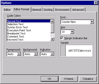 Вкладка Editor Format (Форматы редактора) диалогового окна Options показана на рис. 1.17. На этой вкладке настраиваются стили текста исходного кода приложения — используемый шрифт, цвета, размер текста исходного кода в зависимости от назначения текста кода. Используя параметры данной вкладки, можно выделить цветом, шрифтом и размером шрифта основные элементы программы, например, основной текст, текст комментариев, точки остановки.