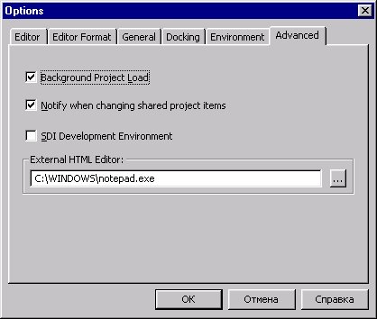 Используя поле External HTML Editor (Внешний редактор HTML) вкладки Advanced, можно установить редактор для работы с HTML-страницами.