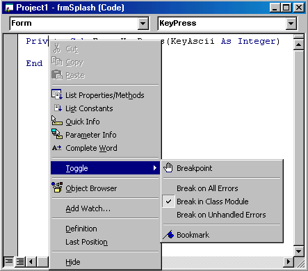 Вызывает меню для установки точек останова, прерываний работы приложения по ошибкам, установки закладок в исходном тексте |