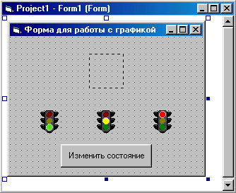 8. Запустите приложение на выполнение. Нажатием кнопки Изменить состояние осуществляется последовательное переключение состояния светофора с помощью присвоения свойству picture объекта imgStatus нового значения.