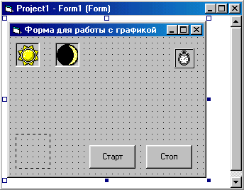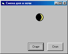 10. Запустите приложение на выполнение. При нажатии кнопки Старт объект, напоминающий солнце, перемещается по форме и при достижении правого нижнего угла меняет изображение, после чего возвращается в исходную точку (рис. 11.9). Нажатие кнопки Стоп переводит приложение в исходное состояние.