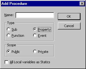 Для ввода необходимого свойства следует вписать его имя в поле Name (Имя) диалогового окна Add Procedure и установить опцию Property (Свойство) в группе переключателей Type (Тип). Данное окно автоматически добавляет в код модуля шаблоны функций property Get и property Let с заданным наименованием свойства.