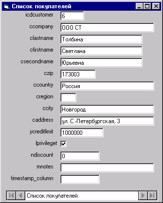 В код обработки события для формы мы добавили присвоение для результирующего множества элемента ADO Data Control. В качестве результирующего множества, которое возвращает набор записей, мы взяли rscomCustomer из окружения данных deSales. Результирующее множество rscomCustomer автоматически создается при выполнении объекта Command comCustomer.