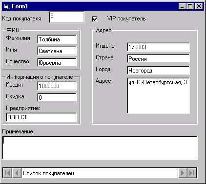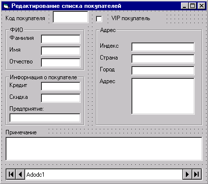 5. После настройки элемента ADO Data Control можно приступить к размещению в форме элементов управления для отображения данных из таблицы. Для удобства рекомендуется располагать элементы таким образом, чтобы пользователю было удобно работать с формой. На рис. 17.10 показано размещение элементов для просмотра информации о покупателях.