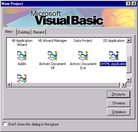 Создайте новый проект, воспользовавшись в диалоговом окне New Project значком DHTML Application (рис. 19.2).
