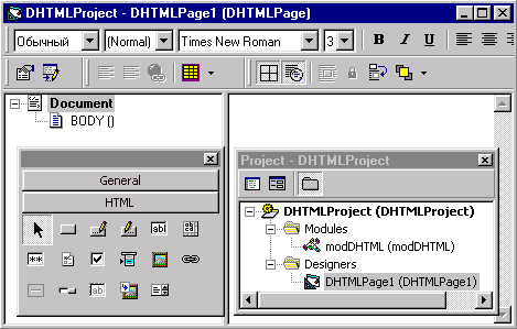 Проект DHTML — одно из предложенных Microsoft средств для создания Internet-приложении, функционирующих на стороне пользователя (поддерживается с версии Internet Explorer 4.01). Важной особенностью DHTML является то, что для написания его кода используется не VBScript, a VBA (полное множество языковых конструкций и возможностей языка Visual Basic). Также удобно то, что работа над проектом осуществляется в привычной для вас интерактивной среде Visual Basic. Однако существенный недостаток DHTML — это то, что для успешного его использования потребуется знакомство с рекомендациями Document Object Model (DOM), разработанными фирмой Microsoft и определяющими множество объектов и их взаимосвязей. Рассмотрение DOM выходит за рамки этой книги. Однако попытаемся познакомиться со средствами разработки DHTML, не углубляясь в сложные детали.