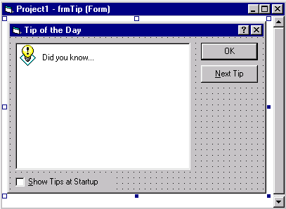 Visual Basic 6 при помощи стандартных шаблонов может помочь вам организовать службу ежедневных кратких полезных советов о работе приложения. Для этого можно использовать шаблон окна Tip of the Day (Ежедневный совет), показанный на рис. 2.33.