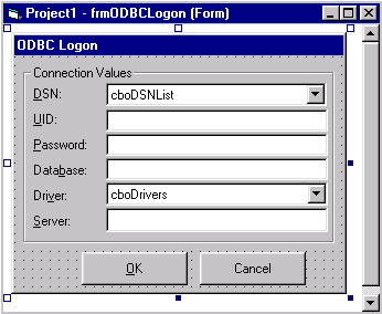 Для приложений, работающих с базами данных, всегда требуется установить соединение с базой данных. Для этого можно использовать стандартный шаблон диалогового окна соединения с базой данных ODBC Logon (рис. 2.34). В этом шаблоне присутствуют следующие поля для ввода данных, требующихся для присоединения к базе данных: