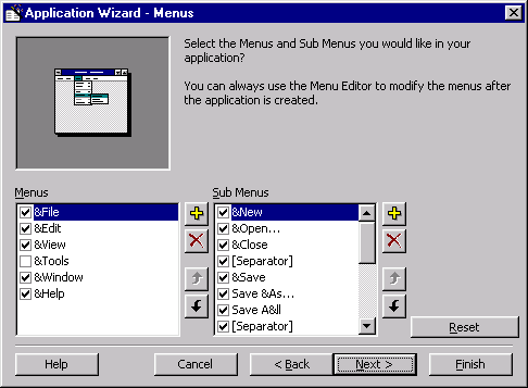 5. На третьем шаге мастера Application Wizard (рис. 2.5) создается меню приложения. Открывшееся диалоговое окно мастера аналогично редактору меню, который более подробно описан в главе 7. Предлагаемое мастером меню создается в стандарте Windows. В диалоговом окне мастера два списка. Список Menus содержит пункты, предлагаемые для включения в строку основного меню. В список Sub Menus входят команды, предлагаемые для включения в пункты меню.