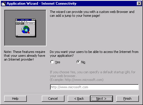 Диалоговое окно Internet Connectivity (Соединение с Internet) содержит две опции. Если установлена опция Yes (Да), то мастером приложений будет создан шаблон окна браузера. При установке опции Yes становится доступным для ввода поле, предназначенное для задания адреса загружаемой Web-страницы (URL). По умолчанию в этом поле задан адрес домашней страницы фирмы Microsoft.
