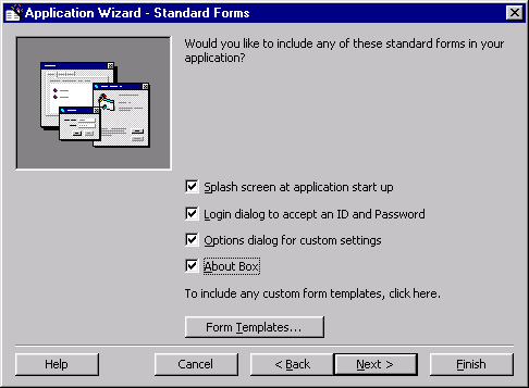 Для того чтобы требуемые вам шаблоны диалоговых окон и форм были созданы и присоединены к приложению, необходимо установить соответствующие флажки.