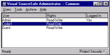Основная задача при работе с пользователями — это поддержка списка пользователей и назначение прав пользователей при операциях с проектами и файлами проектов. Работа с пользователями выполняется в окне администратора Visual SourceSafe Administrator (рис. 20.6), где по умолчанию представлен список пользователей базы данных.