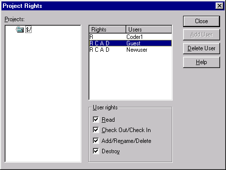 Для настройки прав на проект следует в списке дерева проектов выбрать проект, для которого выполняется настройка прав, затем из правого списка выбрать пользователя и с помощью флажков, расположенных в области User rights (Права пользователя), установить набор необходимых прав. Права устанавливаются немедленно и отображаются в столбце Rights (Права) списка пользователей в виде буквенных сокращений. С помощью этой настройки каждому проекту можно назначить индивидуальные права доступа пользователей к файлам проекта.