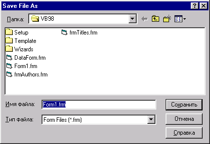 При последующем сохранении проекта Visual Basic по умолчанию сохраняет файлы под их именами. Если же в проект с момента последнего сохранения были добавлены новые компоненты, откроется диалоговое окно Save File As для присвоения им имен.